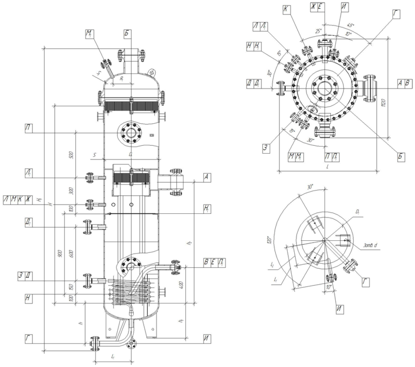 Обозначение Назначение Размеры в зависимости от объёма аппарата А Вход газа 150–350 Б Выход газа 150–350 В Выход конденсата 50–100 Г Дренаж 50 Д Уровнеметр 50 Е Термометр по запросу Ж Термопреобразователь 50/М20х1,5 З Вход теплоносителя 20–25 И Выход теплоносителя 20–25 К Для манометра М20х1,5; Ду 50 Л Отбор давления 50 М Дифманометра по запросу Н Указатель уровня 15–50 П Люк 100–450 -